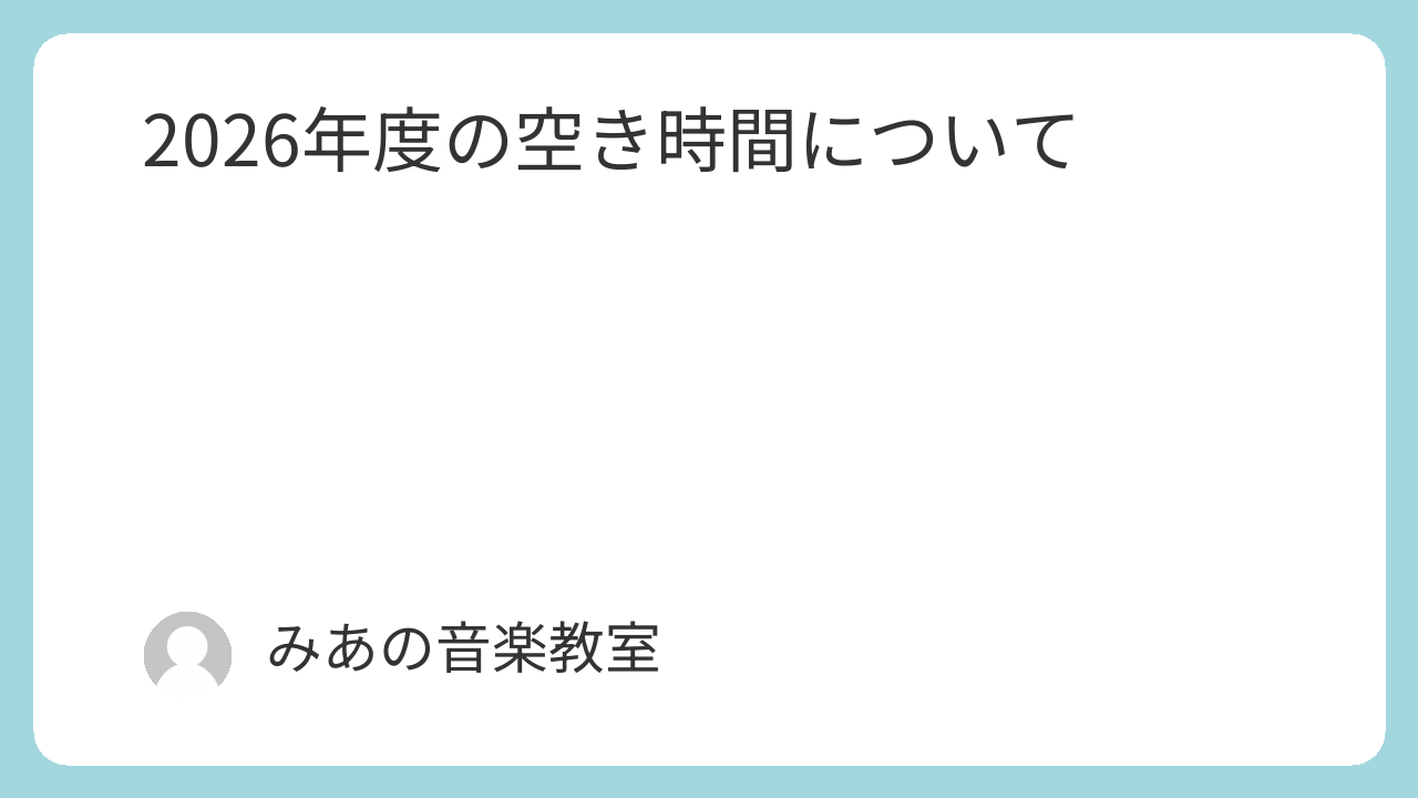 2026年度の空き時間について お知らせ 2026.01.15 2026年度の空き時間について 新年度の空き時間についてです。 2026年度の空き時間につきましては、3月上旬にお知らせいたします。 春の体験レッスンは、3月末ごろの午前中〜15時を考えております。詳しくは3月にお知らせいたします📢 2026年の1・2月の体験レッスンは、現在の空き時間に行っておりますので、詳しくはお尋ねください。